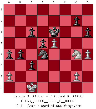 Last move : 0-1 2008 June 25 1:20:38 [Event "FICGS__CHESS__CLASS_E__000073"] [Site "FICGS"] [Date "2008.01.17"] [Round "1"] [White "Dsouza,Stanislaus"] [Black "Cridland,Graham"] [Result "0-1"] [WhiteElo "1367"] [BlackElo "1436"] 1.d4 Nf6 2.c4 c6 3.Bf4 d5 4.e3 Bf5 5.Bd3 Bxd3 6.Qxd3 e6 7.Bg5 Nbd7 8.Nf3 Be7 9.Nc3 O-O 10.O-O dxc4 11.Qc2 Nd5 12.Nxd5 exd5 13.Bxe7 Qxe7 14.Qf5 Qe6 15.Qc2 Rae8 16.Ng5 Qg6 17.Qxg6 fxg6 18.Rac1 h6 19.Nf3 g5 20.Nd2 Kh7 21.Rfe1 Nf6 22.f3 g4 23.fxg4 Nxg4 24.e4 Kg6 25.e5 Nf2 26.Re3 Nd3 27.Rg3+ Kh7 28.Rf1 Rxf1+ 29.Kxf1 Nxb2 30.Nf3 Nd3 31.Nh4 Rf8+ 32.Rf3 Kg8 33.Rxf8+ Kxf8 34.Nf5 c3 35.Ne3 b5 36.Ke2 Nf4+ 37.Kd1 b4 38.Kc2 Ne2 39.Nd1 Nxd4+ 40.Kc1 Ke7 41.Ne3 Ke6 42.Ng4 a5 43.h4 a4 0-1 Queen's pawn game Kingside Castling by player Black (move 9) Kingside Castling by player White (move 10) Player Black won this chess game. Follow this game move after move (download)Robert Fischer is a law unto himself. (Larry Evans) Ein bischen Romantik kann weder im Schach noch in der Liebe schaden. Also versuche ich mich ab und zu daran zu erinnern. (Nigel Short) El Ajedrez era la lengua materna de Capablanca. (Reti) Fischer est le meilleur joueur du monde et Karpov n'est qu'un joueur de bistrot. (Garry Kasparov, agé de 16 ans) There will be no order, only chaos. (Sol Robeson in Pi by Darren Aronofsky)