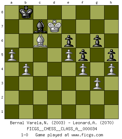 Last move : 1-0 2008 October 5 0:21:45 [Event "FICGS__CHESS__CLASS_A__000034"] [Site "FICGS"] [Date "2008.01.18"] [Round "1"] [White "Bernal Varela,Nelson"] [Black "Leonard,Andrew"] [Result "1-0"] [WhiteElo "2003"] [BlackElo "2070"] 1.e4 c5 2.Nf3 e6 3.d4 cxd4 4.Nxd4 Nc6 5.Nc3 Nf6 6.a3 Bc5 7.Nxc6 dxc6 8.Qxd8+ Kxd8 9.e5 Ng4 10.Ne4 Bd4 11.f4 Ke8 12.c3 Bb6 13.Be2 Ne3 14.Bxe3 Bxe3 15.Rf1 Ke7 16.Rf3 Bb6 17.Rg3 g6 18.Rd1 h5 19.h4 Rd8 20.Rxd8 Bxd8 21.Rd3 Bc7 22.Nf6 c5 23.Rd2 Bb6 24.Rd1 a6 25.Bf3 Rb8 26.b4 cxb4 27.cxb4 Bc7 28.a4 Bb6 29.Ke2 Bc7 30.Be4 Bd8 31.Rd3 Bb6 32.Rd6 Bc7 33.Rd2 Bb6 34.g3 Bd8 35.Rd1 Bc7 36.Rd3 Bb6 37.a5 Bc7 38.Kd2 Bd8 39.Bh1 Bc7 40.Bf3 Kf8 41.Nd7+ Bxd7 42.Rxd7 Rd8 43.Rxd8+ Bxd8 44.Bxb7 Kg7 45.Bxa6 Kf8 46.Bf1 f5 47.Kd3 Ke7 48.Kc4 Kd7 49.Bg2 Bc7 50.Kb5 Kc8 51.Bh1 Bd8 52.Kc6 Kb8 53.Kd7 Bc7 54.Bc6 1-0 Sicilian : Taimanov variation Player White won this chess game. Follow this game move after move (download)There are tough players and nice guys, and I'm a tough player. (Bobby Fischer) Nicht daß Diemer aus Opportunismus Mitglied der NSDAP geworden wäre. Er war ein Fanatiker, in allem, was er tat. (Hans Ree) Los Peones son nacidos libres, y aún así, se encuentran por doquier encadenados. (Rick Kennedy) La tactique, c'est ce que vous faites quand il y a quelque chose à faire; la stratégie, c'est ce que vous faites quand il n'y a rien à faire. (Savielli Tartacower) The Movers & Shakers of this world are those who play chess in the mornings and go to the disco in the evenings. (Dinesh De Silva)