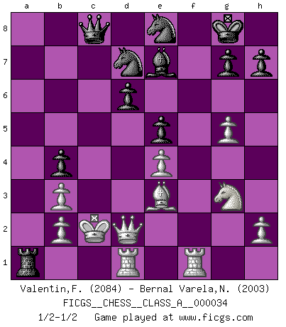 Last move : 1/2-1/2 2008 May 29 21:2:17 [Event "FICGS__CHESS__CLASS_A__000034"] [Site "FICGS"] [Date "2008.01.18"] [Round "1"] [White "Valentin,Florea"] [Black "Bernal Varela,Nelson"] [Result "1/2-1/2"] [WhiteElo "2084"] [BlackElo "2003"] 1.e4 c5 2.Nf3 d6 3.d4 cxd4 4.Nxd4 Nf6 5.Nc3 a6 6.f3 e5 7.Nb3 Be6 8.Be3 Be7 9.Qd2 Nbd7 10.O-O-O b5 11.g4 O-O 12.g5 b4 13.Ne2 Ne8 14.f4 a5 15.f5 a4 16.fxe6 axb3 17.exf7+ Rxf7 18.cxb3 Rxa2 19.Ng3 Rxf1 20.Rhxf1 Ra1+ 21.Kc2 Qc8+ 1/2-1/2 Sicilian : Najdorf Queenside Castling by player White (move 10) Kingside Castling by player Black (move 11) This chess game ended in a draw. Follow this game move after move (download)Nothing excites jaded Grandmasters more than a theoretical novelty. (Dominic Lawson) Das Schach hält seine Meister in eigenen Banden, Fesseln; auf vielerlei Weise formt es ihren Geist, so dass die innere Freiheit selbst des Stärksten beeinflusst wird. (Albert Einstein) Un jugador que trata de regresar una movida en el Ajedrez es un futuro carterista. (Richard Fenton) Le pion, dans sa simplicité, marche droit devant lui, mais lorsqu'il prend, il le fait obliquement? Ainsi l'homme, tant qu'il reste pauvre, marche dans la droiture et vit honnêtement, mais lorsqu'il recherche les honneurs, il flatte, se parjure et, par les voies obliques, cherche une position supérieure sur l'échiquier du monde. (Jean de Galles) Art is the only way to run away without leaving home. (Twyla Tharp)