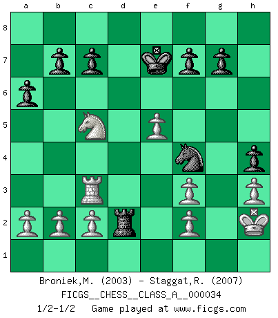Last move : 1/2-1/2 2008 May 29 19:26:27 [Event "FICGS__CHESS__CLASS_A__000034"] [Site "FICGS"] [Date "2008.01.18"] [Round "1"] [White "Broniek,Mariusz Maciej"] [Black "Staggat,Rolf"] [Result "1/2-1/2"] [WhiteElo "2003"] [BlackElo "2007"] 1.e4 e5 2.Nf3 Nc6 3.Bb5 Nf6 4.O-O Nxe4 5.d4 Nd6 6.Bxc6 dxc6 7.dxe5 Nf5 8.Qxd8+ Kxd8 9.Nc3 Ne7 10.Re1 Ng6 11.Be3 Bb4 12.Rad1+ Ke8 13.Nd4 a6 14.Bd2 Bc5 15.Nb3 Be7 16.h3 h5 17.Nd4 Bd7 18.Ne4 c5 19.Nf3 Bc6 20.Bg5 Rd8 21.Rxd8+ Kxd8 22.Nxc5 Bxf3 23.Bxe7+ Kxe7 24.gxf3 Rd8 25.Re3 Rd2 26.Rc3 Nf4 27.Kh2 h4 28.Ne4 Rd7 29.Nc5 Rd2 30.Ne4 Rd7 31.Nc5 Rd2 1/2-1/2 Ruy Lopez : Berlin defense, Open variation Kingside Castling by player White (move 4) This chess game ended in a draw. Follow this game move after move (download)A thorough understanding of the typical mating continuations makes the most complicated sacrificial combinations leading up to them not only not difficult, but almost a matter of course. (Siegbert Tarrasch) Ein Großmeister muß tausende Partien in seinem Kopf speichern, denn diese sind für Ihn, was die Worte der Muttersprache für gewöhnliche Leute sind, oder Noten für Musiker... (Garry Kasparov) El Ajedrez es un expediente tonto que hace creer a la gente inactiva que hacen una cosa muy astuta cuando solamente estan perdiendo su tiempo. (George Bernard Shaw) Donnez-moi un Cavalier en 6e et je gagnerais toutes mes parties. (Steinitz) Luck never gives; it only lends. (Swedish proverb)