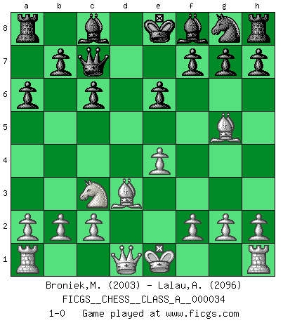 Last move : 1-0 2008 March 5 15:10:49 [Event "FICGS__CHESS__CLASS_A__000034"] [Site "FICGS"] [Date "2008.01.18"] [Round "1"] [White "Broniek,Mariusz Maciej"] [Black "Lalau,Alexandre"] [Result "1-0"] [WhiteElo "2003"] [BlackElo "2096"] 1.e4 c5 2.Nf3 e6 3.d4 cxd4 4.Nxd4 a6 5.Nc3 Qc7 6.Bd3 Nc6 7.Nxc6 dxc6 8.Bg5 1-0 This chess game has been lost on time (started : 2008.01.18 17:33:0) Sicilian : Kan, 5.Nc3 Player White won this chess game. Follow this game move after move (download)The Pawns are the soul of the game. (Francois Andre Danican Philidor) Lisa Lane, amerikanische Schachmeisterin, hatte Fischer einmal als stärksten lebenden Spieler bezeichnet. Antwort: Das ist richtig, aber Lisa Lane ist eigentlich nicht in der Lage, das zu beurteilen. (Robert James Fischer) Un entendimiento a fondo de las continuaciones típicas del mate, hace de las combinaciones de sacrificio mas complicadas conducirlas a ellas no solo sin dificultad, sino casi de una manera natural. (Siegbert Tarrasch) Je ne crois pas en la psychologie, je crois aux bons coups. (Robert Fischer) A bird doesn't sing because it has an answer, it sings because it has a song. (Maya Angelou)