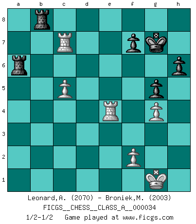 Last move : 1/2-1/2 2008 July 17 23:54:4 [Event "FICGS__CHESS__CLASS_A__000034"] [Site "FICGS"] [Date "2008.01.18"] [Round "1"] [White "Leonard,Andrew"] [Black "Broniek,Mariusz Maciej"] [Result "1/2-1/2"] [WhiteElo "2070"] [BlackElo "2003"] 1.e4 c5 2.Nf3 e6 3.Nc3 a6 4.d4 cxd4 5.Nxd4 Qc7 6.Be2 Nf6 7.O-O Nc6 8.Be3 Bb4 9.Nxc6 bxc6 10.a3 Bxc3 11.bxc3 Nxe4 12.Qd4 Nf6 13.Bf4 Qa7 14.Qd3 O-O 15.Bd6 Re8 16.Rfe1 a5 17.Rad1 Ba6 18.c4 e5 19.Bf3 Qd4 20.Bxe5 Qxc4 21.Qf5 Qe6 22.Qf4 Nd5 23.Qd2 Qg6 24.h4 h6 25.Bxd5 cxd5 26.Qxd5 Qh5 27.Bc3 Qxh4 28.Qxd7 Rec8 29.Bxa5 Qc4 30.a4 Bb7 31.Qxb7 Rxa5 32.Rd7 Rf8 33.Rc7 Qxa4 34.Qe4 Qxe4 35.Rxe4 g5 36.g4 Kg7 37.c4 Ra6 38.c5 Rb8 1/2-1/2 Sicilian defense Kingside Castling by player White (move 7) Kingside Castling by player Black (move 14) This chess game ended in a draw. Follow this game move after move (download)The battle for the ultimate truth will never be won. And that's why Chess is so fascinating. (Hans Kmoch) Bobby Fischer ist kein Vorbild für die heutige Jugend. (Viktor Kortschnoi) ¿Esta Bobby Fischer algo cuerdo?. (Salo Flohr) Botvinnik disait en comparant les échecs à la musique: Il existe une science dont le but est l'étude de l'acoustique et des sons. Mais il y a aussi un art qui se sert de l'océan des sons : c'est la musique. De toute évidence, il en est de même pour la pensée. La logique est l'étude des lois de la réflexion et les échecs reflètent, en tant qu'art, le côté logique de la réflexion, sous la forme d'images artistiques... Extrait de Fischer - Spassky, Reykjavik 1972 par Alexander & F. Wyndham (Ed. Solar), p 37. Somewhere in the world there is an epigram for every dilemma. (Hendrik Willem van Loon)
