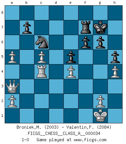 Last move : 1-0 2008 July 3 19:16:59 [Event "FICGS__CHESS__CLASS_A__000034"] [Site "FICGS"] [Date "2008.01.18"] [Round "1"] [White "Broniek,Mariusz Maciej"] [Black "Valentin,Florea"] [Result "1-0"] [WhiteElo "2003"] [BlackElo "2084"] 1.e4 c5 2.Nf3 Nc6 3.Bb5 g6 4.O-O Bg7 5.Re1 e5 6.Bc4 d6 7.Nc3 Nf6 8.d3 O-O 9.Bg5 Bg4 10.h3 Be6 11.Nd5 Nxd5 12.Bxd8 Nf4 13.Bg5 Bxc4 14.dxc4 Ne6 15.Qd2 f6 16.Bh6 Bxh6 17.Qxh6 Ncd4 18.Qd2 Rf7 19.Nxd4 cxd4 20.b3 a5 21.c3 a4 22.cxd4 Nxd4 23.f4 Kg7 24.Qd3 Rc7 25.h4 Rb8 26.bxa4 Ra8 27.Qa3 Ra6 28.fxe5 dxe5 29.Rac1 h5 30.c5 Rac6 31.Rc4 Ne6 32.Rb1 Nd4 33.Rb6 Rf7 34.Rxc6 Nxc6 35.a5 1-0 Sicilian : Nimzovich-Rossolimo attack (with ...g6, without ...d6) Kingside Castling by player White (move 4) Kingside Castling by player Black (move 8) Player White won this chess game. Follow this game move after move (download)Morphy was probably the greatest genius of them all. (Bobby Fischer) Schach verlangt totale Konzentration. (Robert James Fischer) Por tratar de evitar la pérdida de una pieza, muchas personas han perdido una partida de Ajedrez. (Savielly Tartakover) Je fais ceci parce que dans cinquante coups j'obtiendrai cela; je m'appelle Mikhail Moisevitch Botvinnik. (Botvinnik) If you lose the game you should win the analysis! (Proverb)