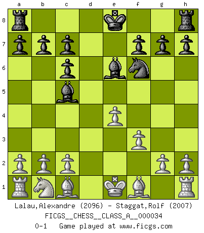 Last move : 0-1 2008 March 8 3:40:1 [Event "FICGS__CHESS__CLASS_A__000034"] [Site "FICGS"] [Date "2008.01.18"] [Round "1"] [White "Lalau,Alexandre"] [Black "Staggat,Rolf"] [Result "0-1"] [WhiteElo "2096"] [BlackElo "2007"] 1.e4 e5 2.Nf3 Nc6 3.d4 exd4 4.Nxd4 Bc5 5.Nxc6 Qf6 6.Qf3 dxc6 7.Qxf6 Nxf6 8.f3 Be6 0-1 This chess game has been lost on time (started : 2008.01.18 17:33:0) Scotch game Player Black won this chess game. Follow this game move after move (download)When your house is on fire, you can't be bothered with the neighbors. Or, as we say in Chess, if your King is under attack you don't worry about losing a Pawn on the Queen's side. (Gary Kasparov) Es ist wirklich schade, dass so viele Schachspieler nicht auf ihr Äußeres achten! (Alexandra Kosteniuk) Coloca el contenido del tablero de Ajedrez en un sombrero, agita las piezas vigorosamente, derrámalas en el tablero desde una altura de medio metro y así obtienes el estilo de Wilhelm Steinitz. (H. E. Bird) On a dit que l'homme se distingue de l'animal par le fait qu'il achète plus de livres qu'il ne peut en lire. Je voudrais suggérer qu'inclure à la liste des livres quelques livres d'échecs rendrait la distinction manifeste. (Edward Lasker) Do not put your faith in what statistics say until you have carefully considered what they do not say. (William W. Watt)