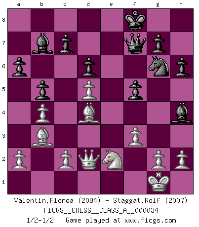 Last move : 1/2-1/2 2008 September 3 13:37:26 [Event "FICGS__CHESS__CLASS_A__000034"] [Site "FICGS"] [Date "2008.01.18"] [Round "1"] [White "Valentin,Florea"] [Black "Staggat,Rolf"] [Result "1/2-1/2"] [WhiteElo "2084"] [BlackElo "2007"] 1.e4 e5 2.Nf3 Nc6 3.Bb5 Nf6 4.O-O Nxe4 5.Re1 Nd6 6.Nxe5 Be7 7.Bf1 Nxe5 8.Rxe5 O-O 9.d4 b6 10.Nc3 Bb7 11.Bf4 Bf6 12.Re1 Nf5 13.d5 d6 14.Qd2 Ne7 15.Bc4 a6 16.Rab1 Ng6 17.Bg3 Qd7 18.f3 Rae8 19.b4 Rxe1+ 20.Rxe1 Re8 21.Ne4 Bd8 22.Bf2 b5 23.Bb3 h6 24.Qc3 Kf8 25.Bd4 f5 26.Ng3 Rxe1+ 27.Qxe1 Bh4 28.Qd2 Qf7 29.Ne2 1/2-1/2 Ruy Lopez : Berlin defense, Open variation Kingside Castling by player White (move 4) Kingside Castling by player Black (move 8) This chess game ended in a draw. Follow this game move after move (download)In Chess, as it is played by masters, chance is practically eliminated. (Emanuel Lasker) Mein Gehirn das ist mein zweitwichtigstes Organ [Aus dem Film: Der Schläfer]. (Woody Allen) No nos podemos resistir a la fascinación de un sacrificio ya que la pasión por los sacrificios es parte de la naturaleza de un jugador de Ajedrez. (Rudolf Spielman) Aux échecs, l'amour-propre est satisfait quand on remporte la victoire, mais il n'y a pas de honte à être battu. (Benjamin Franklin) He who fights with monsters should be careful lest he thereby become a monster. (Friedrich Nietzsche, Beyond Good and Evil)