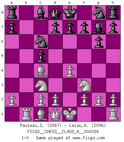 Last move : 1-0 2008 March 2 14:59:7 [Event "FICGS__CHESS__CLASS_A__000034"] [Site "FICGS"] [Date "2008.01.18"] [Round "1"] [White "Paulesu,Sebastiano"] [Black "Lalau,Alexandre"] [Result "1-0"] [WhiteElo "2067"] [BlackElo "2096"] 1.e4 c5 2.b4 b6 3.bxc5 bxc5 4.Nc3 Nc6 5.Rb1 g6 6.Bc4 Bg7 7.Nf3 1-0 This chess game has been lost on time (started : 2008.01.18 17:33:0) Sicilian : wing gambit Player White won this chess game. Follow this game move after move (download)For me, Chess is life and every game is like a new life. Every Chess player gets to live many lives in one lifetime. (Eduard Gufeld) Es gibt nur zwei wahre Schachgenies - das andere war Wilhelm Steinitz, der Weltmeister von 1872 bis 1894. (Robert James Fischer) Bobby Fischer es el jugador de Ajedrez mas grande que jamás haya existido. (Ken Smith) C'est une question de caractère, Beaucoup de gens perdent leur motivation très vite. D'autres, ils sont rares, peuvent la conserver très longtemps. J'aime les échecs, encore aujourd'hui je suis heureux d'analyser des parties. J'aime toujours gagner, je déteste encore perdre. Bien jouer est important pour mon intégrité intellectuelle et morale. Et puis les échecs vivent en ce moment une période historique grâce à Internet. Ils se développent dans les systèmes éducatifs à travers le monde. Ils sortent de leur ghetto, et c'est mon rôle de mener à bien cette révolution. (Gary Kasparov) There's no money in correspondence chess. (John Knudsen)
