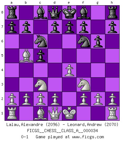 Last move : 0-1 2008 March 10 3:53:29 [Event "FICGS__CHESS__CLASS_A__000034"] [Site "FICGS"] [Date "2008.01.18"] [Round "1"] [White "Lalau,Alexandre"] [Black "Leonard,Andrew"] [Result "0-1"] [WhiteElo "2096"] [BlackElo "2070"] 1.e4 c5 2.Nf3 Nf6 3.Nc3 Nc6 4.Bb5 g6 0-1 This chess game has been lost on time (started : 2008.01.18 17:33:0) Sicilian : Nimzovich-Rubinstein variation Player Black won this chess game. Follow this game move after move (download)Those who say they understand Chess, understand nothing. (Robert Hubner) Obendrein hat der FIDE-Präsident den Revolutionsführer Gaddafi zum »Großmeister« ernannt, am Ende der WM. Das ist lächerlich! (Joel Lautier) La belleza de un movimiento no se refleja solo en su apariencia, sino en el pensamiento detrás de él. (Siegbert Tarrasch) Une platitude souvent récitée à propos des Echecs est qu'une des choses les plus difficiles à réaliser est de gagner une position gagnante. Cela ne manque pas de sens mais, pour ma part, j'ai toujours trouvé plus difficile de gagner une position perdante. (Tim Krabbe) If you work for a living, why do you kill yourself working ? (Tuco to a chicken in The Good, The Bad and The Ugly)