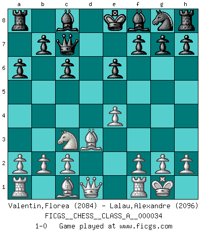 Last move : 1-0 2008 March 7 3:22:10 [Event "FICGS__CHESS__CLASS_A__000034"] [Site "FICGS"] [Date "2008.01.18"] [Round "1"] [White "Valentin,Florea"] [Black "Lalau,Alexandre"] [Result "1-0"] [WhiteElo "2084"] [BlackElo "2096"] 1.e4 c5 2.Nf3 e6 3.d4 cxd4 4.Nxd4 a6 5.Nc3 Qc7 6.Bd3 Nc6 7.Nxc6 dxc6 8.O-O 1-0 This chess game has been lost on time (started : 2008.01.18 17:33:0) Sicilian : Kan, 5.Nc3 Kingside Castling by player White (move 8) Player White won this chess game. Follow this game move after move (download)Strategy requires thought, tactics require observation. (Max Euwe) Im Spitzenschach von heute geht es nur um Vorbereitung, um tiefgründige, sorgfältige Eröffnungsvorbereitung. (Nigel Short) La esencia del Ajedrez es pensar acerca de lo que el Ajedrez es. (David Bronstein) Les pièces de l'échiquier étaient impitoyables. Elles le retenaient, elles l'absorbaient. Il y avait de l'horreur en cela, mais aussi une harmonie unique. Car, qu'y a-t-il dans le monde, à part les échecs ? (V. Nabokov) Thus, what is of supreme importance in war is to attack the enemy's strategy. (Sun Tzu)