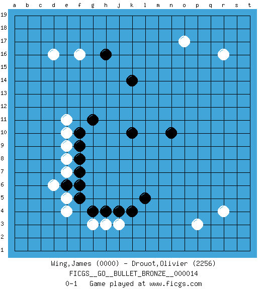 Last move : 0-1 2009 August 15 8:35:23 [Event "FICGS__GO__BULLET_BRONZE__000014"] [Site "FICGS"] [Date "2009.08.15"] [Round "1"] [Black "Wing,James"] [White "Drouot,Olivier"] [Result "0-1"] [Rating 1 "0000"] [Rating 2 "2256"] 1.n10 e4 2.k4 d16 3.f5 e5 4.e6 d6 5.f7 e7 6.f6 e8 7.f8 e9 8.f9 e10 9.f10 e11 10.g11 g3 11.g4 h3 12.h4 j3 13.j4 p3 14.l5 r16 15.k10 o17 16.k14 f16 17.h16 r4 0-1 This go game has been lost on time (started : 2009.08.15 1:47:10) Here are the names of the openings (joseki) played in the four corners : Corner d4 : e4 f5 Takamoku (Gomok, Gaomu`) 5-4 Point. The takamoku (high) point (5-4). With its emphasis on influence, the 5-4 point complements the 4-4 (hoshi) point in creating an influence-oriented fuseki. Corner q4 : p3 l5 Mokuhazushi (Waemok, Wai`mu`) 5-3 Point. The mokuhazushi (5-3) point was popular in the Edo period in Japan (1600 - 1867). It emphasizes influence; territorially, it is inferior to the 3-4 point. Player White won this Go (weiqi, baduk) game. Follow this game move after move (download)The intersection is rarely neutral. (Pierre Audouard) The problem with troubleshooting is that trouble shoots back. (Anonymous)