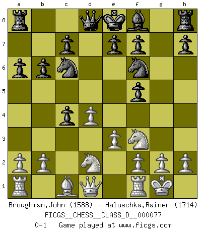Last move : 0-1 2008 April 6 19:6:25 [Event "FICGS__CHESS__CLASS_D__000077"] [Site "FICGS"] [Date "2008.01.20"] [Round "1"] [White "Broughman,John"] [Black "Haluschka,Rainer"] [Result "0-1"] [WhiteElo "1588"] [BlackElo "1714"] 1.d4 Nf6 2.Nf3 d5 3.e3 a6 4.Bd3 b6 5.Nbd2 g6 6.O-O Nc6 7.c3 Bf5 8.Bxf5 gxf5 9.c4 dxc4 0-1 This chess game has been lost on time (started : 2008.01.20 0:29:4) Queen's pawn game Kingside Castling by player White (move 6) Player Black won this chess game. Follow this game move after move (download)In Chess, at least, the brave inherit the earth. (Edmar Mednis) Man gibt nur Pakete auf. (Paul Keres) Aquellos que dicen entender al Ajedrez, no entienden nada. (Robert Hubner) Ce qui caractérise les parties de combat, c'est que si le défenseur a constamment de difficiles problèmes à résoudre, l'attaquant doit chercher sans relâche de nouvelles possibilités d'attaque. (Koblentz) There is no vagueness without wind. (Chinese proverb)