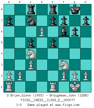 Last move : 1-0 2008 April 19 7:57:55 [Event "FICGS__CHESS__CLASS_D__000077"] [Site "FICGS"] [Date "2008.01.20"] [Round "1"] [White "O Brien,Glenn"] [Black "Broughman,John"] [Result "1-0"] [WhiteElo "1493"] [BlackElo "1588"] 1.e4 c5 2.Nf3 d6 3.d4 Nc6 4.d5 Nb4 5.c3 Na6 6.Bb5+ Bd7 7.Qb3 Nc7 8.Bxd7+ Qxd7 9.Qxb7 Nf6 10.Nbd2 Qc8 11.Qxc8+ Rxc8 12.O-O g6 13.Re1 Bg7 14.Nc4 O-O 15.Bg5 Rfe8 16.Bxf6 Bxf6 17.e5 dxe5 18.d6 1-0 This chess game has been lost on time (started : 2008.01.20 0:29:4) Sicilian Kingside Castling by player White (move 12) Kingside Castling by player Black (move 14) Player White won this chess game. Follow this game move after move (download)Up to this point White has been following well-known analysis. But now he makes a fatal error: he begins to use his own head. (Siegbert Tarrasch) Jeder Fehler erscheint unglaublich dumm, wenn andre ihn begehen. (Georg Christoph Lichtenberg) El Ajedrez es un regaderazo frío para la mente. (Sir John Simon) Même un GMI sait rarement calculer sur plus de cinq coups une attaque à sacrifices. (Rudolf Spielmann) Heh, heh, heh. Time to abandon ship. (General Grievous in Star Wars ep.3)