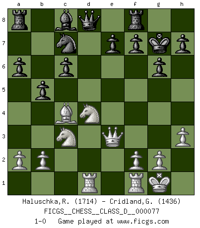 Last move : 1-0 2008 April 30 7:34:47 [Event "FICGS__CHESS__CLASS_D__000077"] [Site "FICGS"] [Date "2008.01.20"] [Round "1"] [White "Haluschka,Rainer"] [Black "Cridland,Graham"] [Result "1-0"] [WhiteElo "1714"] [BlackElo "1436"] 1.d4 Nf6 2.c4 g6 3.Nf3 Bg7 4.Nc3 O-O 5.e4 a6 6.Be2 d6 7.O-O Nbd7 8.h3 c6 9.Be3 b5 10.e5 Ne8 11.Qd2 Bb7 12.Rad1 Nc7 13.Bh6 dxe5 14.Bxg7 Kxg7 15.dxe5 Bc8 16.Nd4 Nxe5 17.Qe3 Nxc4 18.Bxc4 1-0 King's Indian, 3.Nf3 Kingside Castling by player Black (move 4) Kingside Castling by player White (move 7) Player White won this chess game. Follow this game move after move (download)Chess is the art which expresses the science of logic. (Mikhail Botvinnik) Korrekt heißt in Deutschland die Haltung eines Mannes, dessen Benehmen nach dem Urteile seiner Nachbarn seiner Stellung angemessen ist. Um korrekt zu sein, muß man sich der Meinung der anderen anpassen... (Emanuel Lasker) Con o sin el título, Bobby Fischer fue sin lugar a dudas el mas grande jugador de su época. (Burt Hochberg) A chaque perte on perd un peu de soi. (Joël Lautier) I don't diet. I just don't eat as much as I'd like to. (Linda Evangelista, supermodel)