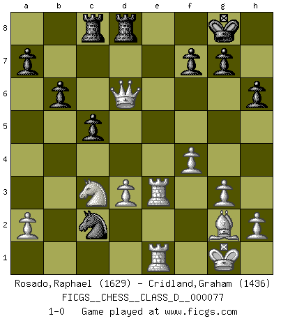 Last move : 1-0 2008 February 15 22:49:1 [Event "FICGS__CHESS__CLASS_D__000077"] [Site "FICGS"] [Date "2008.01.20"] [Round "1"] [White "Rosado,Raphael"] [Black "Cridland,Graham"] [Result "1-0"] [WhiteElo "1629"] [BlackElo "1436"] 1.e4 c5 2.Nc3 e6 3.g3 d5 4.exd5 exd5 5.Bg2 Be6 6.d3 Nc6 7.Nge2 Be7 8.O-O Nf6 9.Bg5 O-O 10.Re1 h6 11.Bxf6 Bxf6 12.Nf4 Qd7 13.Nfxd5 Bxd5 14.Nxd5 Bxb2 15.Rb1 Be5 16.c3 Rad8 17.Qb3 b6 18.Qb5 Rc8 19.Re3 Qd6 20.f4 Bf6 21.Rbe1 Rfd8 22.Qc4 Kf8 23.Qe4 Kg8 24.Qf5 Bxc3 25.Nxc3 Nd4 26.Qe5 Nc2 27.Qxd6 1-0 Sicilian : Closed, Korchnoi variation Kingside Castling by player White (move 8) Kingside Castling by player Black (move 9) Player White won this chess game. Follow this game move after move (download)Even the laziest King flees wildly in the face of a double check ! (Aaron Nimzowitsch) Dein Körper muss in Topform sein. Dein Schach verfällt, wenn dein Körper verfällt. Der Körper kann nicht vom Geist getrennt werden. (Robert James Fischer) La belleza de un movimiento no se refleja solo en su apariencia, sino en el pensamiento detrás de él. (Siegbert Tarrasch) Les Echecs mettent en conflit, non pas deux intelligences, mais deux volontés. (Lasker) Every man's memory is his private literature. (Aldous Huxley)