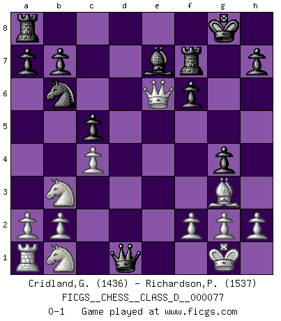 Last move : 0-1 2008 February 27 17:20:59 [Event "FICGS__CHESS__CLASS_D__000077"] [Site "FICGS"] [Date "2008.01.20"] [Round "1"] [White "Cridland,Graham"] [Black "Richardson,Patrick"] [Result "0-1"] [WhiteElo "1436"] [BlackElo "1537"] 1.e4 Nf6 2.e5 Nd5 3.d4 d6 4.Nf3 Bg4 5.Be2 e6 6.O-O Be7 7.c4 Nb6 8.Qc2 Nc6 9.Rd1 O-O 10.Bf4 g5 11.Bg3 Bf5 12.Bd3 Nb4 13.Qe2 Bxd3 14.Rxd3 Nxd3 15.Qxd3 dxe5 16.Bxe5 f6 17.Bg3 g4 18.Nfd2 c5 19.Qe2 Qxd4 20.Qxe6+ Rf7 21.Nb3 Qd1+ 0-1 Alekhine's defense : Modern variation, 4...Bg4 Kingside Castling by player White (move 6) Kingside Castling by player Black (move 9) Player Black won this chess game. Follow this game move after move (download)White lost because he failed to remember the right continuation and had to think up the moves himself. (Siegbert Tarrasch) Kein Schachspieler kann gut schlafen. (H. G. Wells) Los Peones son nacidos libres, y aún así, se encuentran por doquier encadenados. (Rick Kennedy) Aux échecs, l'amour-propre est satisfait quand on remporte la victoire, mais il n'y a pas de honte à être battu. (Benjamin Franklin) Every vice is only an exaggeration of a necessary and virtuous function. (Ralph Waldo Emerson, Journals 1936)
