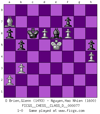 Last move : 1-0 2008 June 4 11:35:28 [Event "FICGS__CHESS__CLASS_D__000077"] [Site "FICGS"] [Date "2008.01.20"] [Round "1"] [White "O Brien,Glenn"] [Black "Nguyen,Hao Nhien"] [Result "1-0"] [WhiteElo "1493"] [BlackElo "1600"] 1.e4 e5 2.Nf3 Nc6 3.Bb5 a6 4.Ba4 Nf6 5.O-O Be7 6.Re1 d6 7.c3 O-O 8.h3 Be6 9.d4 exd4 10.cxd4 d5 11.e5 Nd7 12.Bc2 Nb4 13.Nc3 Nxc2 14.Qxc2 c5 15.Bd2 cxd4 16.Nxd4 Qc7 17.Nxd5 Qd8 18.Nxe7+ Qxe7 19.Qc7 Bd5 20.Qd6 Qxd6 21.exd6 Rfe8 22.Rxe8+ Rxe8 23.b3 g6 24.Re1 Rxe1+ 25.Bxe1 Kf8 26.Bb4 Kg7 27.f4 Kf6 28.g3 Be4 29.Kf2 g5 30.Ke3 Bd5 31.Ba5 gxf4+ 32.gxf4 h6 33.Bd8+ Kg7 34.Nf5+ Kh7 35.h4 Be6 36.Ne7 Bg4 37.Ba5 Kg7 38.Bc3+ Kf8 39.Nd5 h5 40.Nf6 Nxf6 41.Bxf6 Ke8 42.Kd4 Kd7 43.Ke5 b6 44.f5 b5 45.Bg5 Bf3 46.f6 Kc6 47.Bd2 Bg4 48.Bc3 Be6 49.Ba1 Bd7 50.Bd4 Bg4 51.Bf2 Be6 52.Ba7 1-0 Ruy Lopez : Closed, Averbach variation Kingside Castling by player White (move 5) Kingside Castling by player Black (move 7) Player White won this chess game. Follow this game move after move (download)Openings teach you openings. Endgames teach you chess ! (Stephan Gerzadowicz) Ich hatte Zahnschmerzen im ersten Spiel. In der zweiten Partie tat mir der Kopf weh. In der dritten war es eine Rheuma-Attacke und während der vierten fühlte ich mich nicht gut. Und in der fünften? Nun, man muss doch nicht jedes Spiel gewinnen, oder? (Savielly Grigorievitsch Tartakower) El Ajedrez es un cuento de Hadas de las 1001 metidas de pata. (Savielly Tartakower) Mon pion favori sur ma case favorite ! Bronstein en parlant d'un coup de pion en h5 quand il avait les Noirs. Perseverance does not equal worthiness. Next time you want to get my attention, wear something fun. Low-riding jeans are hot. (Gregory House, House M.D.)