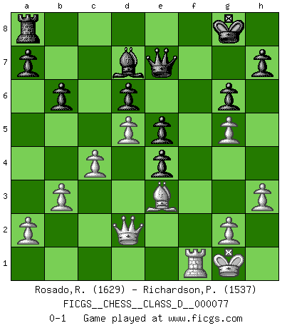 Last move : 0-1 2008 June 1 23:23:10 [Event "FICGS__CHESS__CLASS_D__000077"] [Site "FICGS"] [Date "2008.01.20"] [Round "1"] [White "Rosado,Raphael"] [Black "Richardson,Patrick"] [Result "0-1"] [WhiteElo "1629"] [BlackElo "1537"] 1.e4 Nf6 2.e5 Nd5 3.c4 Nb6 4.d4 d6 5.exd6 cxd6 6.Nc3 g6 7.Be3 Bg7 8.Rc1 O-O 9.b3 Nc6 10.d5 Ne5 11.Be2 f5 12.f4 Ng4 13.Bd4 Bh6 14.Qd2 Nd7 15.Nf3 Nc5 16.Ng5 Bxg5 17.fxg5 Ne4 18.Nxe4 fxe4 19.Bxg4 Bxg4 20.Bf2 e5 21.O-O b6 22.h3 Bd7 23.Rce1 Rf4 24.Be3 Rxf1+ 25.Rxf1 Qe7 0-1 Alekhine's defense Kingside Castling by player Black (move 8) Kingside Castling by player White (move 21) Player Black won this chess game. Follow this game move after move (download)I thought the most common mistake [in chess] was the first one: Learning the game :P (Garvin Gray, FICGS forum) Ich bin es gewohnt, das die Jugend mir überhaupt keinen Respekt entgegenbringt. (Alexander Morozewich) Las piezas de Ajedrez son los bloques del alfabeto que moldean los pensamientos; y esos pensamientos, aunque hagan un diseño visual en el tablero, expresan abstractamente su belleza como un poema. (Marcel Duchamp) Les échecs, c'est l'art d'analyser. (Mikhail Botvinnik) Your best chance to get a Royal Flush in a casino is in the bathroom. (Anonymous)