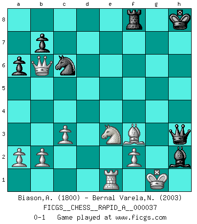 Last move : 0-1 2008 May 22 7:15:32 [Event "FICGS__CHESS__RAPID_A__000037"] [Site "FICGS"] [Date "2008.01.20"] [Round "1"] [White "Biason,Adriano"] [Black "Bernal Varela,Nelson"] [Result "0-1"] [WhiteElo "1800"] [BlackElo "2003"] 1.e4 c5 2.Nf3 d6 3.d4 cxd4 4.Nxd4 Nf6 5.Nc3 a6 6.Be3 Ng4 7.Bg5 h6 8.Bh4 g5 9.Bg3 Bg7 10.h3 Ne5 11.Nf5 Bxf5 12.exf5 Nbc6 13.Nd5 e6 14.fxe6 fxe6 15.Ne3 O-O 16.c3 d5 17.Be2 Ng6 18.Qc2 Nf4 19.Rd1 Rc8 20.Bxf4 gxf4 21.Ng4 Qe8 22.Bd3 e5 23.Qb3 Qf7 24.O-O e4 25.Be2 Rcd8 26.Rfe1 h5 27.Nh2 Rd7 28.Qb6 Qg6 29.Bc4 f3 30.g4 hxg4 31.Rxd5 Kh8 32.Nxg4 Rxd5 33.Bxd5 Qh5 34.Bxe4 Qxh3 35.Ne3 Be5 36.Bxf3 Bh2+ 0-1 Sicilian : Najdorf, Byrne (English) attack Kingside Castling by player Black (move 15) Kingside Castling by player White (move 24) Player Black won this chess game. Follow this game move after move (download)Chess holds its master in its own bonds, shackling the mind and brain so that the inner freedom of the very strongest must suffer. (Albert Einstein) Rubinstein ist ein Turmendspiel, welches die Götter vor tausenden von Jahren begannen. (Savielly Grigorievitsch Tartakower) Debemos de asegurarnos de que el Ajedrez no se convierta en un lenguaje muerto, muy interesante, pero solo para un grupo muy pequeño. (Sytze Faber) On a dit que l'homme se distingue de l'animal par le fait qu'il achète plus de livres qu'il ne peut en lire. Je voudrais suggérer qu'inclure à la liste des livres quelques livres d'échecs rendrait la distinction manifeste. (Edward Lasker) May I never be complete. May I never be content. May I never be perfect. Deliver me, Tyler, from being perfect and complete. (Chuck Palahniuk, Fight Club)