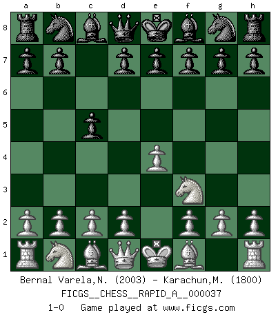Last move : 1-0 2008 February 23 2:20:24 [Event "FICGS__CHESS__RAPID_A__000037"] [Site "FICGS"] [Date "2008.01.20"] [Round "1"] [White "Bernal Varela,Nelson"] [Black "Karachun,Max"] [Result "1-0"] [WhiteElo "2003"] [BlackElo "1800"] 1.e4 c5 2.Nf3 1-0 This chess game has been lost on time (started : 2008.01.20 16:57:26) Sicilian defense Player White won this chess game. Follow this game move after move (download)We must make sure that Chess will not be like a dead language, very interesting, but for a very small group. (Sytze Faber) Frage: Gibt es etwas was Sie mehr lieben als Autobahnen ohne Tempobegrenzungen? - Antwort: Deutsche Frauen ohne Tempobegrenzungen. (Loek van Wely) Las leyes del Ajedrez no permiten una libre elección: tienes que mover quieras o no. (Emanuel Lasker) Les Echecs mettent en conflit, non pas deux intelligences, mais deux volontés. (Lasker) Memory... is the diary that we all carry with us. (Oscar Wilde, The Importance of Being Earnest)