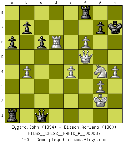 Last move : 1-0 2008 May 16 8:31:10 [Event "FICGS__CHESS__RAPID_A__000037"] [Site "FICGS"] [Date "2008.01.20"] [Round "1"] [White "Eygard,John"] [Black "Biason,Adriano"] [Result "1-0"] [WhiteElo "1834"] [BlackElo "1800"] 1.c4 e5 2.Nc3 Bb4 3.Nd5 Be7 4.Nf3 d6 5.d4 c6 6.Nxe7 Qxe7 7.Bg5 f6 8.Be3 Na6 9.g3 Qf7 10.Bg2 Ne7 11.O-O Qxc4 12.Nd2 Qe6 13.dxe5 fxe5 14.Ne4 d5 15.Ng5 Qf6 16.f4 e4 17.Bd4 Qg6 18.Qb3 Nf5 19.Rad1 h6 20.Nh3 Nxd4 21.Rxd4 O-O 22.Nf2 Nc5 23.Qc3 Ne6 24.Rd2 d4 25.Rxd4 Nxd4 26.Qxd4 e3 27.Nd3 Qf7 28.b3 Qh5 29.Qc4+ Kh8 30.Ne5 Bf5 31.Bf3 Qe8 32.Qb4 Rb8 33.Qc5 a6 34.Qxe3 Rd8 35.Qc5 Rf6 36.e4 Bh3 37.Re1 Rd2 38.f5 Rxa2 39.Rd1 Kh7 40.b4 h5 41.Qc3 Bg4 42.Bxg4 hxg4 43.Nxg4 Rf8 44.Qf3 Ra4 45.f6 Qg6 46.Rd6 Qg5 47.h4 Ra1+ 48.Kg2 Qc1 49.Qf5+ 1-0 English, Kramnik-Shirov counterattack Kingside Castling by player White (move 11) Kingside Castling by player Black (move 21) Player White won this chess game. Follow this game move after move (download)Fischer is under obligation to nobody. (Joseph Platz) Je älter ich werde, um so mehr schätze ich die Bauern. (Paul Keres) Nunca nadie ha ganado una partida de Ajedrez rindiendose. (Unknown) Si je n'étais pas joueur d'échecs, je serais le meilleur dans quelque chose d'autre. (Anatoli Karpov) The message for business people contemplating their place in the cyberspace is simple and direct: get linked or get lost. (Vic Sussman and Kenan Pollack)