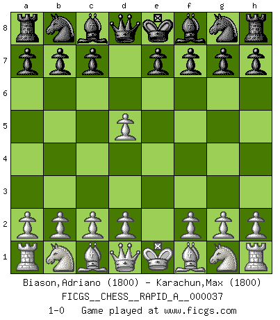 Last move : 1-0 2008 February 21 13:56:11 [Event "FICGS__CHESS__RAPID_A__000037"] [Site "FICGS"] [Date "2008.01.20"] [Round "1"] [White "Biason,Adriano"] [Black "Karachun,Max"] [Result "1-0"] [WhiteElo "1800"] [BlackElo "1800"] 1.e4 d5 2.exd5 1-0 This chess game has been lost on time (started : 2008.01.20 16:57:26) Scandinavian (centre counter) defense Player White won this chess game. Follow this game move after move (download)The enormous mental resilience, without which no Chess player can exist, was so much taken up by Chess that he could never free his mind of this game. (Albert Einstein) Ein Gewinn durch eine ungenaue Kombination, sei sie auch noch so vorzeigbar, erfüllt mich mit Schaudern. (Wilhelm Steinitz) El jugador blanco perdió porque fallo en recordar la coreccta continuación y tuvo que pensar por sí mismo las movidas. (Siegbert Tarrasch) Celui qui prend des risques peut perdre, celui qui n'en prend pas perd toujours. (Xavier Tartacover) Quotation,n.: The act of repeating erroneously the words of another. The words erroneously repeated. (Ambrose Bierce, The Devil's Dictionary)