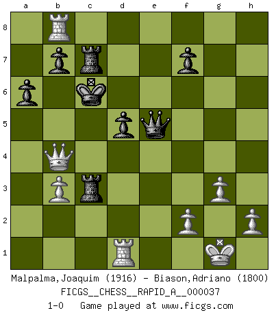 Last move : 1-0 2008 March 26 7:23:50 [Event "FICGS__CHESS__RAPID_A__000037"] [Site "FICGS"] [Date "2008.01.20"] [Round "1"] [White "Malpalma,Joaquim"] [Black "Biason,Adriano"] [Result "1-0"] [WhiteElo "1916"] [BlackElo "1800"] 1.e4 c5 2.d4 cxd4 3.c3 dxc3 4.Nxc3 e6 5.Nf3 Bc5 6.Bc4 Ne7 7.O-O O-O 8.Qe2 Ng6 9.Rd1 Nc6 10.Bg5 Qc7 11.Rac1 h6 12.Be3 Bxe3 13.Qxe3 a6 14.a4 Rd8 15.Bb3 Rb8 16.Ne2 d6 17.Nfd4 Nge7 18.Qg3 Qb6 19.Rd3 Nxd4 20.Rxd4 Nc6 21.R4d1 Bd7 22.Nf4 Nd4 23.Bc4 Bxa4 24.b3 Bb5 25.Nh5 g6 26.Nf6+ Kg7 27.Nh5+ Kf8 28.Qe3 gxh5 29.Rxd4 Ke8 30.Bxb5+ Qxb5 31.Rd5 Qb4 32.Rxh5 Rbc8 33.Rf1 Rc3 34.Qxh6 Rc5 35.Rh3 Qd4 36.Rf3 Rc3 37.Rf4 Qe5 38.g3 Rd7 39.Qh7 Kf8 40.Rg4 Rdc7 41.Rg8+ Ke7 42.Rb8 d5 43.exd5 exd5 44.Qh4+ Kd6 45.Qb4+ Kc6 46.Rd1 1-0 Sicilian : Smith-Morra gambit Kingside Castling by player White (move 7) Kingside Castling by player Black (move 7) Player White won this chess game. Follow this game move after move (download)It's just you and your opponent at the board and you're trying to prove something. (Bobby Fischer) Wer sich die Fähigkeit anerziehen will im Schach selbstständig zu denken, der muß alles meiden, was leblos ist: ausgeklügelte Theorien, die sich auf sehr wenige Beispiele und eine Menge Hirngespinste stützen. (Emanuel Lasker) Bobby es la celebridad menos entendida y malinterpretada que camina el la faz de esta tierra. (Yasser Seirawan) Des idées, des idées, j'en ai cent, j'en ai mille. Des bonnes, des mauvaises, applicables, irréalisables... Il suffit de faire le tri ! (Roos) If you lose the game you should win the analysis! (Proverb)