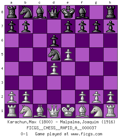 Last move : 0-1 2008 February 25 14:38:16 [Event "FICGS__CHESS__RAPID_A__000037"] [Site "FICGS"] [Date "2008.01.20"] [Round "1"] [White "Karachun,Max"] [Black "Malpalma,Joaquim"] [Result "0-1"] [WhiteElo "1800"] [BlackElo "1916"] 1.e4 c5 2.d4 cxd4 3.c3 Nf6 4.e5 Nd5 5.cxd4 d6 0-1 This chess game has been lost on time (started : 2008.01.20 16:57:26) Sicilian : Smith-Morra gambit Player Black won this chess game. Follow this game move after move (download)If you aren't afraid of Spassky, then I have removed the element of money. (Jim Slater) Schach ist wie eine schöne Frau, zu der wir ständig zurückkehren, gleichviel, wie oft sie uns zurückweist. (Anonymous) Botvinnik trató de alejar el misterio referente al Ajedrez, siempre relacionandolo a situaciones de la vida diaria. Solía llamar al Ajedrez un problema inexacto típico, similar a aquellos en que la gente tiene siempre que resolver a cada día. (Garry Kasparov) C'est la seule position que je connaisse où les deux camps sont mals. Propos prêtés à V. Anand. Statistics can be made to prove anything - even the truth. (Author unknown)