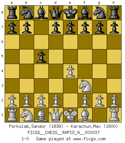 Last move : 1-0 2008 February 27 2:43:30 [Event "FICGS__CHESS__RAPID_A__000037"] [Site "FICGS"] [Date "2008.01.20"] [Round "1"] [White "Porkolab,Sandor"] [Black "Karachun,Max"] [Result "1-0"] [WhiteElo "1838"] [BlackElo "1800"] 1.e4 c5 2.Nf3 1-0 This chess game has been lost on time (started : 2008.01.20 16:57:26) Sicilian defense Player White won this chess game. Follow this game move after move (download)There are tough players and nice guys, and I'm a tough player. (Bobby Fischer) Es genügt nicht ein guter Spieler zu sein, man muß auch gut spielen. (Siegbert Tarrasch) La mitad de las variaciones que son calculadas en una partida de torneo, resultan ser completamente superfluas. Desafortunadamente, nadie sabe por adelantado cual mitad. (Jan Tinman) Les échecs, c'est l'art d'analyser. (Mikhail Botvinnik) Chess, like love, like music, has the power to make people happy. (Siegbert Tarrasch)