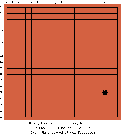 Last move : 1-0 2006 August 7 16:3:59 [Event "FICGS__GO__TOURNAMENT__000005"] [Site "FICGS"] [Date "2006.07.02"] [Round "1"] [Black "Alakay,Canbek"] [White "Edmeier,Michael"] [Result "1-0"] 1.r5 1-0 This go game has been lost on time (started : 2006.07.02 17:26:59) Here are the names of the openings (joseki) played in the four corners : Corner q4 : r5 1-0 Mokuhazushi (Waemok, Wai`mu`) 5-3 Point. The mokuhazushi (5-3) point was popular in the Edo period in Japan (1600 - 1867). It emphasizes influence; territorially, it is inferior to the 3-4 point. Player Black won this Go (weiqi, baduk) game. Follow this game move after move (download)Keep inessential ataris till the end. (Anonymous) O divine art of subtlety and secrecy! Through you we learn to be invisible, through you inaudible and hence we can hold the enemy's fate in our hands. (Sun Tzu)