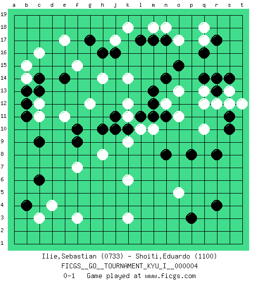 Last move : 0-1 2008 May 10 21:32:30 [Event "FICGS__GO__TOURNAMENT_KYU_I__000004"] [Site "FICGS"] [Date "2008.01.21"] [Round "1"] [Black "Ilie,Sebastian"] [White "Shoiti,Eduardo"] [Result "0-1"] [Rating 1 "0733"] [Rating 2 "1100"] 1.q16 c16 2.r4 d4 3.p3 o17 4.q14 j17 5.c6 f3 6.c9 q10 7.r8 r12 8.r13 q12 9.o15 q17 10.r17 q18 11.n17 n18 12.m17 m18 13.l17 k18 14.g17 e17 15.h16 k3 16.p8 c12 17.c14 b14 18.b13 b15 19.c13 k6 20.b4 c3 21.e14 f7 22.f9 o5 23.n8 k9 24.n11 e11 25.f10 k12 26.m13 g12 27.h10 h8 28.j11 k11 29.k10 l10 30.j10 h14 31.j16 f15 32.b12 c11 33.b11 s13 34.s14 q13 35.r14 t12 36.s11 s12 37.s10 o13 38.n14 n12 39.m12 k14 40.l11 m10 41.m11 o11 0-1 This go game has been lost on time (started : 2008.01.21 4:33:35) Here are the names of the openings (joseki) played in the four corners : Corner q16 : q16 o17 Hoshi (Hwajeom, Seongjeom, Xingwei`) 4-4 Point. The star or hoshi (4-4) point, emphasizing influence at the potential expense of territory. Ikken Kakari (Hankan Keolch'im, Yi Gua`jiao~, 1-Space Low Approach). White 2 is the standard approach move to the 4-4. Corner d4 : d4 c6 Hoshi (Hwajeom, Seongjeom, Xingwei`) 4-4 Point. The star or hoshi (4-4) point, emphasizing influence at the potential expense of territory. Ikken Kakari (Hankan Keolch'im, Yi Gua`jiao~, 1-Space Low Approach). Black 2 is the standard approach move to the 4-4. Player White won this Go (weiqi, baduk) game. Follow this game move after move (download)In the opening, when you don't know what to play, make a shimari. (Jansteen) Gambling is the son of avarice and the father of despair. (French proverb)