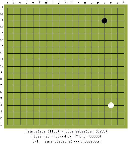 Last move : 0-1 2008 February 22 14:1:48 [Event "FICGS__GO__TOURNAMENT_KYU_I__000004"] [Site "FICGS"] [Date "2008.01.21"] [Round "1"] [Black "Heim,Steve"] [White "Ilie,Sebastian"] [Result "0-1"] [Rating 1 "1100"] [Rating 2 "0733"] 1.q17 r4 0-1 This go game has been lost on time (started : 2008.01.21 4:33:35) Here are the names of the openings (joseki) played in the four corners : Corner q4 : r4 0-1 Komoku (Somok, Xiao~mu`) 3-4 Point. The komoku (3-4) point is the traditional corner enclosure move.. Player White won this Go (weiqi, baduk) game. Follow this game move after move (download)Learning josekis by heart is useless if you don't try departing from them. (Pierre Audouard) A good book on your shelf is a friend that turns its back on you and remains a friend. (Author unknown)