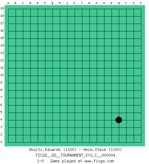 Last move : 1-0 2008 February 21 1:54:38 [Event "FICGS__GO__TOURNAMENT_KYU_I__000004"] [Site "FICGS"] [Date "2008.01.21"] [Round "1"] [Black "Shoiti,Eduardo"] [White "Heim,Steve"] [Result "1-0"] [Rating 1 "1100"] [Rating 2 "1100"] 1.q4 1-0 This go game has been lost on time (started : 2008.01.21 4:33:35) Here are the names of the openings (joseki) played in the four corners : Corner q4 : q4 1-0 Hoshi (Hwajeom, Seongjeom, Xingwei`) 4-4 Point. The star or hoshi (4-4) point, emphasizing influence at the potential expense of territory. Player Black won this Go (weiqi, baduk) game. Follow this game move after move (download)Take the cutting stone on the second line. (Anonymous) When you've done things right people won't know you've done anything at all. (Futurama)