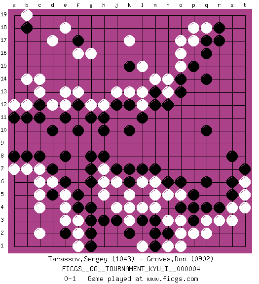 Last move : 0-1 2008 April 8 18:31:19 [Event "FICGS__GO__TOURNAMENT_KYU_I__000004"] [Site "FICGS"] [Date "2008.01.21"] [Round "1"] [Black "Tarassov,Sergey"] [White "Groves,Don"] [Result "0-1"] [Rating 1 "1043"] [Rating 2 "0902"] 1.q16 c4 2.q4 d17 3.q10 e4 4.k4 k17 5.d10 c14 6.g3 o17 7.q14 q18 8.r17 c7 9.e2 c2 10.c12 o3 11.q6 q2 12.m3 r3 13.r4 s4 14.s5 s3 15.c8 b7 16.b8 g16 17.d7 e13 18.k10 o15 19.o13 m14 20.m13 l13 21.m12 l12 22.l11 o5 23.o6 n5 24.n6 m5 25.k7 l4 26.l3 k5 27.j5 j4 28.j3 k3 29.k2 j6 30.h3 h5 31.f5 h12 32.h10 f11 33.g8 a7 34.a8 d6 35.d5 c5 36.e6 c6 37.e8 e5 38.j7 h7 39.h8 n14 40.r18 p17 41.f10 c13 42.f12 e12 43.g11 g12 44.k12 k13 45.j12 j13 46.e11 f13 47.h11 b12 48.b11 d12 49.c11 a12 50.a11 b14 51.p3 p2 52.n2 o2 53.p5 n3 54.m2 t5 55.s6 t6 56.t7 t4 57.s8 n13 58.n12 f3 59.g4 f2 60.g2 f1 61.f4 e3 62.g1 m6 63.m7 l6 64.l7 k4 65.p15 o16 66.q17 p18 67.b18 b19 68.f17 e18 69.g6 h6 70.g7 q3 71.p4 f16 72.o14 m4 73.o4 n1 74.m1 o1 75.k15 l15 76.k6 l1 0-1 Here are the names of the openings (joseki) played in the four corners : Corner q16 : q16 o17 Hoshi (Hwajeom, Seongjeom, Xingwei`) 4-4 Point. The star or hoshi (4-4) point, emphasizing influence at the potential expense of territory. Ikken Kakari (Hankan Keolch'im, Yi Gua`jiao~, 1-Space Low Approach). White 2 is the standard approach move to the 4-4. Corner q4 : q4 o3 Hoshi (Hwajeom, Seongjeom, Xingwei`) 4-4 Point. The star or hoshi (4-4) point, emphasizing influence at the potential expense of territory. Ikken Kakari (Hankan Keolch'im, Yi Gua`jiao~, 1-Space Low Approach). White 2 is the standard approach move to the 4-4. Player White won this Go (weiqi, baduk) game. Follow this game move after move (download)When your opponent is thick, you must also become thick. (Otake Hideo, 9p) When the going gets tactical, the computers get going. (Hyatt)