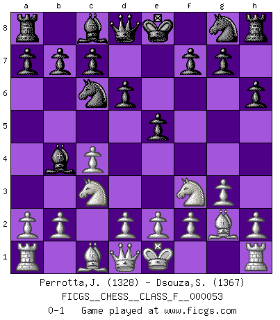 Last move : 0-1 2008 March 22 4:49:19 [Event "FICGS__CHESS__CLASS_F__000053"] [Site "FICGS"] [Date "2008.01.21"] [Round "1"] [White "Perrotta,John Zach"] [Black "Dsouza,Stanislaus"] [Result "0-1"] [WhiteElo "1328"] [BlackElo "1367"] 1.c4 e5 2.Nf3 Nc6 3.Nc3 h6 4.g3 Bb4 5.Bg2 d6 0-1 This chess game has been lost on time (started : 2008.01.21 8:14:0) English, Nimzovich variation Player Black won this chess game. Follow this game move after move (download)Chess is 99 percent tactics. (Teichmann) Ein Gewinn durch eine ungenaue Kombination, sei sie auch noch so vorzeigbar, erfüllt mich mit Schaudern. (Wilhelm Steinitz) El Ajedrez es un juego terrible. Si no dominas el centro, tu oponente tiene una posición mas libre. Si tu tienes el centro, entonces realmente tienes algo de que preocuparte. (Siegbert Tarrasch) Je menace de comprendre la position. (Anonyme) You have to believe in yourself. (Sun Tzu)