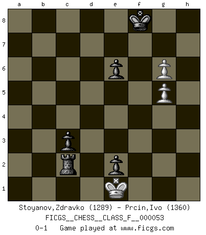 Last move : 0-1 2008 February 25 20:27:52 [Event "FICGS__CHESS__CLASS_F__000053"] [Site "FICGS"] [Date "2008.01.21"] [Round "1"] [White "Stoyanov,Zdravko"] [Black "Prcin,Ivo"] [Result "0-1"] [WhiteElo "1289"] [BlackElo "1360"] 1.e4 e6 2.Nf3 d5 3.e5 c5 4.Bb5+ Nc6 5.Bxc6+ bxc6 6.c3 f6 7.h3 Ba6 8.d3 fxe5 9.Nxe5 Qc7 10.Qh5+ Ke7 11.Qf7+ Kd6 12.Qh5 Nf6 13.Qg5 h6 14.Qe3 Rg8 15.O-O c4 16.d4 Ke7 17.Qg3 Kd8 18.Bf4 Qb7 19.Qg6 Kc8 20.b4 Bb5 21.Nf7 Qd7 22.Ne5 Qe7 23.Nd2 Nd7 24.Ndf3 a5 25.Nf7 axb4 26.Bd6 Qf6 27.Qxf6 Nxf6 28.Bxb4 Bxb4 29.cxb4 Rf8 30.Nd6+ Kd7 31.Nb7 Ne4 32.Ne5+ Kc7 33.Nc5 Kd6 34.Nxe4+ dxe4 35.Rfc1 Kd5 36.Rd1 Ra3 37.Ng4 Ba4 38.Rdc1 Kxd4 39.Ne3 c3 40.Nc2+ Bxc2 41.Rxc2 Kc4 42.Rb1 Rb8 43.Re1 Kd3 44.R2c1 c2 45.Kf1 Rxa2 46.Re3+ Kd4 47.Re2 Rxb4 48.Rexc2 Rxc2 49.Rxc2 c5 50.Ke2 g5 51.f3 e3 52.g3 c4 53.h4 c3 54.hxg5 hxg5 55.f4 Rb2 56.fxg5 Rxc2+ 57.Kd1 e2+ 58.Ke1 Ke5 59.g4 Kd6 60.g6 Ke7 61.g5 Kf8 0-1 French defense Kingside Castling by player White (move 15) 10 pieces endgame at move 54 : White KRPP , Black KRPPPP WHITE : King + 1 Rook 2 Pawns BLACK : King + 1 Rook 4 Pawns 9 pieces endgame at move 56 : White KRPP , Black KRPPP WHITE : King + 1 Rook 2 Pawns BLACK : King + 1 Rook 3 Pawns 8 pieces endgame at move 56 : White KPP , Black KRPPP WHITE : King + 2 Pawns BLACK : King + 1 Rook 3 Pawns Player Black won this chess game. Follow this game move after move (download)When you are lonely, when you feel yourself an alien in the world, play Chess. This will raise your spirits and be your counselor in war. (Aristotle) Alles was am Schachbrett zählt sind gute Züge. (Robert James Fischer) La única cosa que los jugadores de Ajedrez tienen en común, es el Ajedrez. (Lodewijk Prins) Les erreurs sont comme les malheurs, elles n'arrivent jamais seules. (Siegbert Tarrasch) Computer Science is no more about computers than astronomy is about telescopes. (Edsger W. Dijkstra)