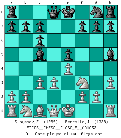 Last move : 1-0 2008 March 2 14:59:7 [Event "FICGS__CHESS__CLASS_F__000053"] [Site "FICGS"] [Date "2008.01.21"] [Round "1"] [White "Stoyanov,Zdravko"] [Black "Perrotta,John Zach"] [Result "1-0"] [WhiteElo "1289"] [BlackElo "1328"] 1.e4 e5 2.Nf3 Nc6 3.Bb5 Bc5 4.Bxc6 dxc6 5.d3 Bg4 6.h3 Bh5 7.c3 1-0 This chess game has been lost on time (started : 2008.01.21 8:14:0) Ruy Lopez : Classical (Cordel) defense Player White won this chess game. Follow this game move after move (download)Dazzling combinations are for the many, shifting wood is for the few. (Georg Kieninger) Schach ist das Spiel, das die Verrückten gesund hält. (Albert Einstein) El Ajedrez es un mar en el cual un mosquito puede beber y un elefante puede bañarse. (Refrán Hindú) Il n'y a pas eu de défaite parce que je ne crois pas que cet ordinateur ait jamais existé. IBM a triché en refusant d'imprimer les modes de recherche de la machine. C'est évident, pendant le match, des coups décisifs ont été joués par des êtres humains. Aujourd'hui, les meilleurs spécialistes en informatique ne peuvent toujours pas expliquer comment Deep-Blue a pu jouer contre la logique des ordinateurs. IBM a gagné une guerre de communication, mais ils sont incapables de prouver que l'ordinateur a gagné tout seul. (Garry Kasparov) I couldn't make any sense out of what this particular thread is about. It sounds like R2 D2 computer speaking. A space fight ?!? Some 'command' problems in Moscow ? Some killers & narcotic addicts attacking some game & a god wannabe ?? (Dinesh De Silva, lost in a russian conflict in FICGS forum)