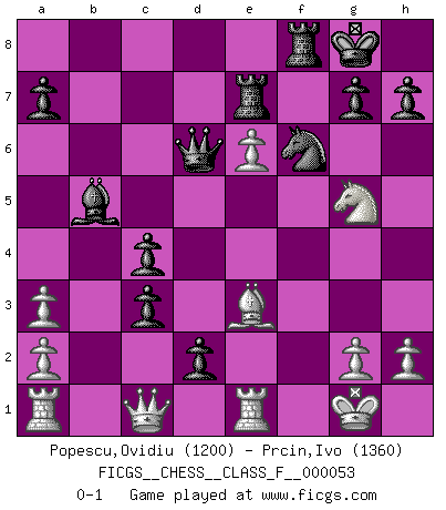 Last move : 0-1 2008 February 22 8:30:55 [Event "FICGS__CHESS__CLASS_F__000053"] [Site "FICGS"] [Date "2008.01.21"] [Round "1"] [White "Popescu,Ovidiu"] [Black "Prcin,Ivo"] [Result "0-1"] [WhiteElo "1200"] [BlackElo "1360"] 1.e4 e6 2.d4 d5 3.e5 c5 4.Nf3 Nc6 5.Bb5 Bd7 6.O-O Qb6 7.Na3 cxd4 8.c3 Bxa3 9.Bxc6 bxc6 10.bxa3 dxc3 11.Ng5 f6 12.exf6 Nxf6 13.Re1 c5 14.Qd3 d4 15.f4 O-O 16.Qc4 Rae8 17.f5 Bb5 18.Qb3 c4 19.Qd1 d3 20.Be3 Qd6 21.fxe6 Re7 22.Qc1 d2 0-1 French : Advance, Nimzovich system Kingside Castling by player White (move 6) Kingside Castling by player Black (move 15) Player Black won this chess game. Follow this game move after move (download)Chess is the gymnasium of the mind. (Blaise Pascal) Ich bin stolz ein Bulgare zu sein. (Veselin Topalov) El poder defensivo de una pieza clavada, solamente es imaginario. (Aaron Nimzovich) Le système Elo représente seulement une moyenne. Il est simplement un indicateur de votre stabilité. (Anatoli Karpov) Secret operations are essential in war; upon them the army relies to make its every move. (Sun Tzu)