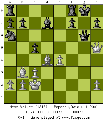 Last move : 0-1 2008 February 3 20:18:56 [Event "FICGS__CHESS__CLASS_F__000053"] [Site "FICGS"] [Date "2008.01.21"] [Round "1"] [White "Hess,Volker"] [Black "Popescu,Ovidiu"] [Result "0-1"] [WhiteElo "1319"] [BlackElo "1200"] 1.e4 e5 2.Nf3 d5 3.exd5 e4 4.Nd4 Qxd5 5.c3 Nf6 6.Bb5+ c6 7.Ba4 Bc5 8.Bb3 Qg5 9.d3 Qxg2 10.Rf1 Bh3 11.Nd2 O-O 12.Nxe4 Qxf1+ 13.Kd2 Nxe4+ 14.dxe4 Qxf2+ 15.Qe2 Qf4+ 16.Kc2 Qd6 17.Be3 Bxd4 18.Bxd4 Na6 19.Rg1 g6 20.Rg3 Bd7 21.Qh5 c5 22.Rxg6+ Qxg6 0-1 QP counter-gambit (elephant gambit) Kingside Castling by player Black (move 11) Player Black won this chess game. Follow this game move after move (download)Chess is like life. (Boris Spassky) Ich organisiere ein großes Turnier, was mich etwa 120000 Dollar kostet. Ich denke, das ist das erste Mal in der Schachgeschichte, daß ein Schachgroßmeister auch als Mäzen auftritt. (Miguel Najdorf) La estratégia requiere pensar, la táctica requiere observación. (Max Euwe) J'ai toujours senti une vague pitié pour l'homme qui ne connaît rien aux échecs, tout comme j'en aurais pour un homme ignorant de l'amour. Les Echecs, comme la musique ou comme l'amour, ont le pouvoir de rendre heureux. (Siegbert Tarrasch) The difference between stupidity and genius is that genius has its limits. (Murphy)