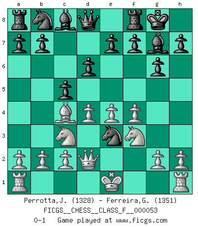 Last move : 0-1 2008 March 3 15:0:9 [Event "FICGS__CHESS__CLASS_F__000053"] [Site "FICGS"] [Date "2008.01.21"] [Round "1"] [White "Perrotta,John Zach"] [Black "Ferreira,Getulio"] [Result "0-1"] [WhiteElo "1328"] [BlackElo "1351"] 1.f4 Nf6 2.Nc3 g6 3.e4 d6 4.Bc4 Bg7 5.d4 O-O 6.Nf3 c5 7.Be3 Ng4 8.Qd2 Nxe3 0-1 This chess game has been lost on time (started : 2008.01.21 8:14:0) Bird's Opening Kingside Castling by player Black (move 5) Player Black won this chess game. Follow this game move after move (download)By the beauty of his games, the clarity of his play, and the brilliance of his ideas, Fischer made himself an artist of the same stature as Brahms, Rembrandt, and Shakespeare. (David Levy) Wir können eben der zündenden Macht des Opfers nicht wiederstehen, denn die Begeisterung für das Opfer liegt in der Natur des Menschen. (Rudolf Spielmann) Yo considero que Fischer es uno de los expertos mas grandes de aperturas de siempre. (Keith Hayward) À la honte des hommes, on sait que les lois du jeu sont les seules qui soient partout justes, claires, inviolables et exécutées. Pourquoi l'Indien qui a donné les règles du jeu d'échecs est-il obéi de bon gré dans toute la terre, et que les décrétales des papes, par exemple, sont aujourd'hui un objet d'horreur et de mépris ? C'est que l'inventeur des échecs combina tout avec justesse pour la satisfaction des joueurs, et que les papes, dans leurs décrétales, n'eurent en vue que leur seul avantage. L'Indien voulut exercer également l'esprit des hommes et leur donner du plaisir; les papes ont voulu abrutir l'esprit des hommes. Voltaire (Dictionnaire philosophique / Garnier 1967) The age of a woman doesn't mean a thing. The best tunes are played on the oldest fiddles. (Ralph Waldo Emerson)