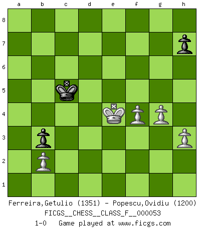 Last move : 1-0 2008 July 21 7:9:28 [Event "FICGS__CHESS__CLASS_F__000053"] [Site "FICGS"] [Date "2008.01.21"] [Round "1"] [White "Ferreira,Getulio"] [Black "Popescu,Ovidiu"] [Result "1-0"] [WhiteElo "1351"] [BlackElo "1200"] 1.c4 e6 2.e4 d5 3.cxd5 exd5 4.exd5 Qxd5 5.Nc3 Qc5 6.d4 Qb6 7.Nf3 Bg4 8.Bb5+ c6 9.Be2 Nd7 10.Ne5 Bxe2 11.Nxd7 Bxd1 12.Nxb6 axb6 13.Nxd1 O-O-O 14.Be3 Nf6 15.Nc3 Bb4 16.O-O c5 17.dxc5 bxc5 18.Na4 Ng4 19.Bxc5 Bxc5 20.Nxc5 Rd2 21.Rac1 Kb8 22.h3 Nf6 23.Rb1 b6 24.Nb3 Rd5 25.Rfe1 Rf8 26.Re7 Rd7 27.Rxd7 Nxd7 28.Re1 f6 29.Re7 Nc5 30.Nxc5 bxc5 31.Rxg7 Rd8 32.Rg3 Kb7 33.Rb3+ Kc6 34.Kh2 c4 35.Rb4 Kc5 36.a3 Rd2 37.Kg3 f5 38.Rb8 Rd3+ 39.f3 Rb3 40.Rxb3 cxb3 41.Kf4 Kc4 42.a4 Kb4 43.a5 Kxa5 44.Kxf5 Kb5 45.Ke4 Kc6 46.g4 Kc5 47.f4 1-0 English Opening Queenside Castling by player Black (move 13) Kingside Castling by player White (move 16) 10 pieces endgame at move 40 : White KPPPPP , Black KPPP WHITE : King + 5 Pawns BLACK : King + 3 Pawns 9 pieces endgame at move 43 : White KPPPP , Black KPPP WHITE : King + 4 Pawns BLACK : King + 3 Pawns 8 pieces endgame at move 44 : White KPPPP , Black KPP WHITE : King + 4 Pawns BLACK : King + 2 Pawns Player White won this chess game. Follow this game move after move (download)Your body has to be in top condition. Your Chess deteriorates as your body does. You can't separate body from mind. (Bobby Fischer) Konzentriere dich auf materielle Gewinne. Nimm, was dir dein Gegner gibt, ausser es gibt einen guten Grund der dagegenspricht. (Robert James Fischer) Yo adoro todas la posiciones. Denme una partida posicional difícil, y la jugaré. Pero posiciones totalmente ganadas, no las tolero. (Hein Donner) Toutes choses étant égales, c'est la conviction qui gagne. Alliée à une volonté de vaincre, elle sert de détonateur, suscite des idées, disperse les doutes et aide à penser clairement. (Robert Fischer) You can think I'm wrong, but that's no reason to quit thinking. (Gregory House, House M.D.)