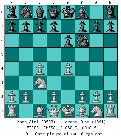 Last move : 1-0 2008 March 17 4:26:7 [Event "FICGS__CHESS__CLASS_G__000019"] [Site "FICGS"] [Date "2008.01.22"] [Round "1"] [White "Mach,Jiri"] [Black "Lorena,June"] [Result "1-0"] [WhiteElo "0903"] [BlackElo "1061"] 1.c4 Nf6 2.Nc3 e6 3.e4 1-0 This chess game has been lost on time (started : 2008.01.22 3:22:38) English : Mikenas-Carls variation Player White won this chess game. Follow this game move after move (download)Let the perfectionist play postal. (Yasser Seirawan) Weshalb minderdergeübte Spieler mit g2-g4 beginnen? Die betreffenden sind unschlüssig, ob sie nun rechts (h4) oder links (f4) beginnen sollen, und in ihrer Ratlosigkeit entschliessen sie sich nach guter Bürgerart dazu, den goldenen Mittelweg zu wählen. (Aaron Nimzowitsch) Tu cuerpo tiene que estar en óptima condición. Tu Ajedrez se deteriora como lo hace tu cuerpo. No puedes separar la mente y el cuerpo. (Bobby Fischer) Aucun coup ne doit être joué sans but. (Pedro Damiano) Quotation,n.: The act of repeating erroneously the words of another. The words erroneously repeated. (Ambrose Bierce, The Devil's Dictionary)