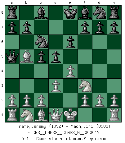 Last move : 0-1 2008 February 17 23:29:29 [Event "FICGS__CHESS__CLASS_G__000019"] [Site "FICGS"] [Date "2008.01.22"] [Round "1"] [White "Frame,Jeremy"] [Black "Mach,Jiri"] [Result "0-1"] [WhiteElo "1092"] [BlackElo "0903"] 1.e4 c5 2.Nf3 Nc6 3.Bc4 e6 4.d3 d5 5.Bb5 Qa5+ 0-1 Sicilian defense Player Black won this chess game. Follow this game move after move (download)Bobby Fischer's current state of mind is indeed a tragedy. One of the world's greatest Chess players - the pride and sorrow of American Chess. (Frank Brady) Ein unbeabsichtigtes Patt ist der Gipfel der Dummheit. (Anonymous) El poder defensivo de una pieza clavada, solamente es imaginario. (Aaron Nimzovich) RxDa4 pat (...) Wisdom begins at the end. (Daniel Webster)