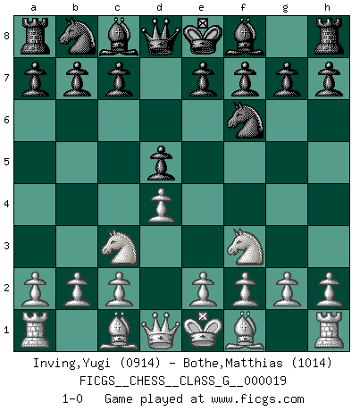 Last move : 1-0 2008 March 3 2:59:57 [Event "FICGS__CHESS__CLASS_G__000019"] [Site "FICGS"] [Date "2008.01.22"] [Round "1"] [White "Inving,Yugi"] [Black "Bothe,Matthias"] [Result "1-0"] [WhiteElo "0914"] [BlackElo "1014"] 1.Nf3 d5 2.Nc3 Nf6 3.d4 1-0 This chess game has been lost on time (started : 2008.01.22 3:22:38) Reti Opening Player White won this chess game. Follow this game move after move (download)The blunders are all there on the board, waiting to be made. (Savielly Tartakover) Ein Teil des Fehlers ist immer korrekt. (Savielly Grigorievitsch Tartakower) Dejen al perfeccionista jugar por correo. (Yasser Seirawan) Le profane ne songe pas à la somme de jouissance dont il se prive, qui méconnaît ce jeu aux ressources aussi variées que passionnantes. (Jean-Marie Jeanton-Lamarche) Before all elsed, be armed. (Niccolo Machiavelli)