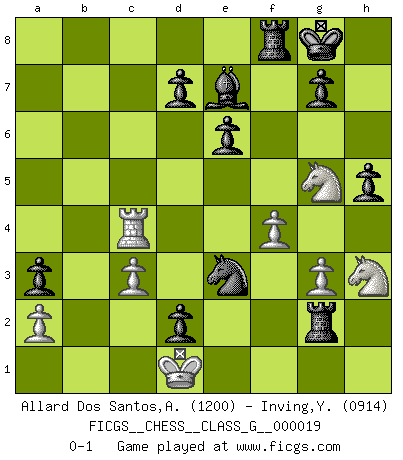 Last move : 0-1 2008 March 22 22:56:22 [Event "FICGS__CHESS__CLASS_G__000019"] [Site "FICGS"] [Date "2008.01.22"] [Round "1"] [White "Allard Dos Santos,Alexandre"] [Black "Inving,Yugi"] [Result "0-1"] [WhiteElo "1200"] [BlackElo "0914"] 1.e4 f5 2.e5 Nc6 3.f4 e6 4.Bb5 a6 5.Bxc6 bxc6 6.Nc3 Qh4+ 7.g3 Qg4 8.Qxg4 fxg4 9.h3 Nh6 10.hxg4 Nxg4 11.Rh4 h5 12.d4 Be7 13.Rh1 Bb7 14.Nf3 c5 15.Rf1 cxd4 16.Ne2 c5 17.c3 d3 18.Neg1 O-O 19.Nh3 Rab8 20.Nfg5 c4 21.Kd2 Nxe5 22.b4 Ng4 23.Ba3 a5 24.Rae1 Bg2 25.Rg1 axb4 26.Rxg2 bxa3 27.Re4 Rb2+ 28.Kc1 Rxg2 29.Rxc4 d2+ 30.Kd1 Ne3+ 0-1 Fred Kingside Castling by player Black (move 18) Player Black won this chess game. Follow this game move after move (download)I play correspondence chess because it is both art and science while chess is art only. (A player at FICGS) Es hat in meinem Leben Zeiten gegeben, da ich sehr nahe daran war zu glauben, daß ich auch nicht eine einzige Schachpartie verlieren könnte. (José Raúl Capablanca) Estaba muy claro de que el punto vulnerable del Gran Maestro Americano (Bobby Fischer) radicaba en las posiciones de doble filo, colgantes, irracionales, donde el siempre falló en encontrar un triunfo aún en una posición de clara victoria. (Efim Geller) Le temps de noter son nom sur la feuille de partie, j'étais déjà en zeitnot ! D'un modeste amateur apparié lors de la première ronde d'un open contre le grand-maître Azmaïparashvili. Humor is by far the most significant activity of the human brain. (Edward De Bono)