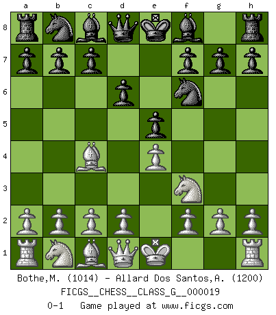 Last move : 0-1 2008 March 4 3:1:47 [Event "FICGS__CHESS__CLASS_G__000019"] [Site "FICGS"] [Date "2008.01.22"] [Round "1"] [White "Bothe,Matthias"] [Black "Allard Dos Santos,Alexandre"] [Result "0-1"] [WhiteElo "1014"] [BlackElo "1200"] 1.e4 e5 2.Nf3 d6 3.Bc4 Nf6 0-1 This chess game has been lost on time (started : 2008.01.22 3:22:38) Philidor's defense Player Black won this chess game. Follow this game move after move (download)Man is a frivolous, a specious creature, and like a Chess player, cares more for the process of attaining his goal than for the goal itself. (Dostoyevsky) Fischer ist das größte Genie, das je vom Schachhimmel heruntergestiegen ist. (Mikhail Nekhemyevich Tal) El Ajedrez expande y enriquece tu mente. (Saudin Robovic) Toute estimation doit être constamment réévaluée. (Jacob Estrin) God is an atheist. (Unknown)