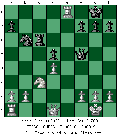 Last move : 1-0 2008 June 6 3:1:52 [Event "FICGS__CHESS__CLASS_G__000019"] [Site "FICGS"] [Date "2008.01.22"] [Round "1"] [White "Mach,Jiri"] [Black "Uno,Joe"] [Result "1-0"] [WhiteElo "0903"] [BlackElo "1200"] 1.Nf3 d5 2.c4 Nf6 3.d4 e6 4.Nc3 Bd6 5.Bg5 O-O 6.cxd5 c6 7.e4 exd5 8.e5 Be7 9.exf6 Bxf6 10.Bxf6 Qxf6 11.Be2 b5 12.O-O Bf5 13.Re1 Nd7 14.Bxb5 Nb6 15.Bd3 Rfe8 16.Ne5 Rac8 17.Bxf5 Qxf5 18.Nxc6 Rxc6 19.Rxe8+ 1-0 Reti Opening Kingside Castling by player Black (move 5) Kingside Castling by player White (move 12) Player White won this chess game. Follow this game move after move (download)First-class players lose to second-class players because second-class players sometimes play a first-class game. (Siegbert Tarrasch) Jede Eröffnung ist gut genug um gespielt zu werden, wenn nur ihr Ruf schlecht genug ist. (Savielly Grigorievitsch Tartakower) Peones: ellos son el alma de esta partida, solos forman el ataque y la defensa. (Philidor) Les Echecs ne sont pas pour les âmes timides. Ils requièrent un homme entier, qui ne s'arrête pas aveuglément à ce qui a été déjà établi, mais qui tente individuellement de sonder les profondeurs du jeu. (W. Steinitz) At work, the authority of a person is inversely proportional to the number of pens that person is carrying. (Dan Rotaru)