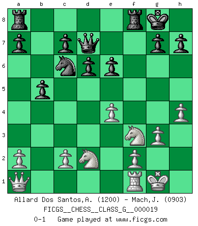Last move : 0-1 2008 June 11 11:59:32 [Event "FICGS__CHESS__CLASS_G__000019"] [Site "FICGS"] [Date "2008.01.22"] [Round "1"] [White "Allard Dos Santos,Alexandre"] [Black "Mach,Jiri"] [Result "0-1"] [WhiteElo "1200"] [BlackElo "0903"] 1.e4 e5 2.d4 exd4 3.Qxd4 Nc6 4.Qd1 Nf6 5.Bg5 Be7 6.Bxf6 Bxf6 7.Nf3 Bxb2 8.Nbd2 Bxa1 9.Qxa1 O-O 10.Bc4 d6 11.O-O Be6 12.Bxe6 fxe6 13.g3 b5 14.h4 Qd7 0-1 This chess game has been lost on time (started : 2008.01.22 3:22:38) Centre game Kingside Castling by player Black (move 9) Kingside Castling by player White (move 11) Player Black won this chess game. Follow this game move after move (download)It is always better to sacrifice your opponent's men. (Savielly Tartakower) Aljechin war kein Nazi. Er war ein Opportunist. Ein schrecklicher Mann. Er liebte Geld über alles und würde für Geld ein Jude, ein Katolik oder ein Protestant werden. (Miguel Najdorf) Sin errores no puede haber brillantez. (Emanuel Lasker) Vous savez, camarade Pachman, je n'éprouve pas de plaisir à être ministre, je jouerais plutôt aux échecs comme vous, ou alors ferais une révolution au Venezuela. (Che Guevara à Ludek Pachman, 'Checkmate in Prague', 1975) All art requires courage. (Anne Tucker)
