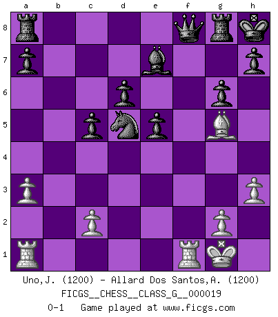 Last move : 0-1 2008 March 12 0:53:46 [Event "FICGS__CHESS__CLASS_G__000019"] [Site "FICGS"] [Date "2008.01.22"] [Round "1"] [White "Uno,Joe"] [Black "Allard Dos Santos,Alexandre"] [Result "0-1"] [WhiteElo "1200"] [BlackElo "1200"] 1.e4 e5 2.Nf3 d6 3.Bc4 Nf6 4.d3 Be6 5.O-O g6 6.Nc3 Bxc4 7.dxc4 c5 8.a3 Nc6 9.Be3 Nd4 10.b4 Nxf3+ 11.Qxf3 b6 12.Bg5 Be7 13.bxc5 bxc5 14.Qh3 O-O 15.Nd5 Nxd5 16.Bd2 Nb6 17.Bh6 Re8 18.f3 Nxc4 19.f4 Nd2 20.f5 Nxe4 21.fxg6 fxg6 22.Qe6+ Kh8 23.Qf7 Rg8 24.Qd5 Nf6 25.Bg5 Qf8 26.h3 Nxd5 0-1 Philidor's defense Kingside Castling by player White (move 5) Kingside Castling by player Black (move 14) Player Black won this chess game. Follow this game move after move (download)The isolated Pawn casts gloom over the entire chessboard. (Aaron Nimzovich) Ohne Fehler kann es keine Brillanz geben. (Emanuel Lasker) El Ajedrez es despiadado: debes de estar preparado para matar gente. (Nigel Short) Des combinaisons [dans le jeu d'échecs] pareilles à des mélodies. Je crois entendre pour ainsi dire la musique des coups... (Vladimir Nabokov) The various flowers seem good to different people. (Chinese proverb)
