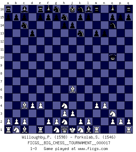 Last move : 1-0 2008 March 10 15:54:18 [Event "FICGS__BIG_CHESS__TOURNAMENT__000017"] [Site "FICGS"] [Date "2008.01.24"] [Round "1"] [White "Willoughby,Peter"] [Black "Porkolab,Sandor"] [Result "1-0"] [WhiteElo "1598"] [BlackElo "1546"] 1.j2-h4 j15-k13 2.e2-e4 h16-o10 3.p1-o3 b16-c14 4.m2-m4 p16-o14 5.n2-n4 d15-d13 6.d2-d4 n15-n13 7.f1-c4 m15-m13 8.o1-j6 1-0 This big chess game has been lost on time (started : 2008.01.24 7:47:27) Follow this game move after move (download)Fischer sacrificed virtually everything most of us weakies (to use his term) value, respect, and cherish, for the sake of an artful, often beautiful board game, for the ambivalent privilege of being its greatest master. (Paul Kollar) Mit sehr nachdenklichem Gesicht schreitet Bobby durch den Turniersaal. Was ist passiert?, fragt Lombardy. Ich stehe schlecht, antwortet Fischer. Lombardy: Dann biete doch einfach Remis an. Fischer: So schlecht stehe ich nun auch wieder nicht! (Robert James Fischer) Tu sabes, camarada Pachman, no disfruto el ser un Ministro, preferería jugar al Ajedrez como tu. (Che Guevara) Le jeu d'échecs fait naître et fortifie en nous plusieurs qualités précieuses dans le cours de l'existence, telles que la prévoyance, la circonspection, la prudence, et la persévérance. (Benjamin Franklin - 1783, la morale des échecs) The intuitive mind is a sacred gift; the rational mind is a faithful servant. We have created a society that honors the servant but has forgotten the gift. (Albert Einstein)