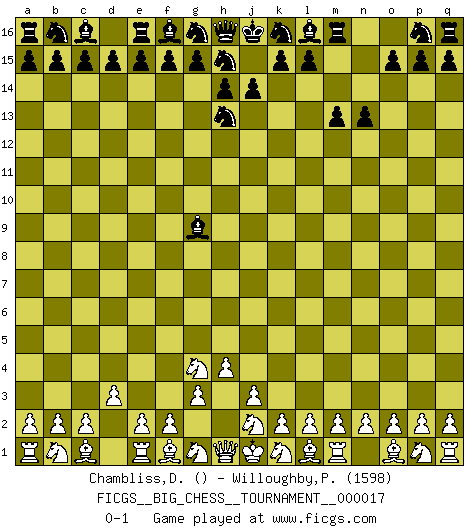 Last move : 0-1 2008 February 29 14:48:43 [Event "FICGS__BIG_CHESS__TOURNAMENT__000017"] [Site "FICGS"] [Date "2008.01.24"] [Round "1"] [White "Chambliss,Daniel"] [Black "Willoughby,Peter"] [Result "0-1"] [WhiteElo ""] [BlackElo "1598"] 1.h2-g4 j15-h13 2.g2-g3 m15-m13 3.h3-h4 n15-n13 4.d2-d3 o16-g9 0-1 This big chess game has been lost on time (started : 2008.01.24 7:47:27) Follow this game move after move (download)After a bad opening, there is hope for the middle game. After a bad middle game, there is hope for the endgame. But once you are in the endgame, the moment of truth has arrived. (Edmar Mednis) Schach wird sich dank seiner hohen kulturellen Tradition immer durchsetzen. In näherer Zukunft womöglich sogar als Gegenreaktion auf die maßlose Reizüberflutung im Freizeit- und Spielbereich. (Garry Kasparov) Muchos se han convertido en Maestros de Ajedrez, nadie se ha convertido en el Maestro del Ajedrez. (Siegbert Tarrasch) Les erreurs sont comme les malheurs, elles n'arrivent jamais seules. (Siegbert Tarrasch) If you have any trouble condescending, find a Unix user to show you how it's done. (Scott Adams)