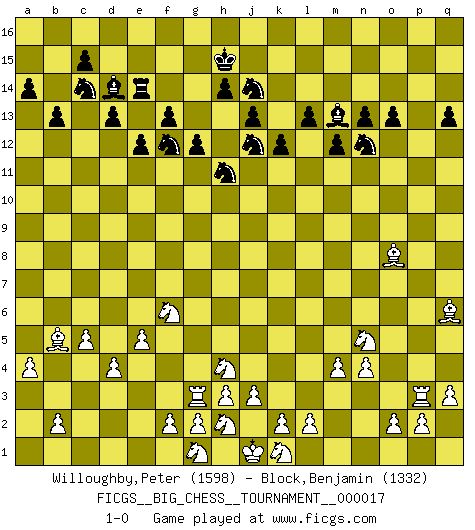 Last move : 1-0 2008 March 1 18:48:35 [Event "FICGS__BIG_CHESS__TOURNAMENT__000017"] [Site "FICGS"] [Date "2008.01.24"] [Round "1"] [White "Willoughby,Peter"] [Black "Block,Benjamin"] [Result "1-0"] [WhiteElo "1598"] [BlackElo "1332"] 1.j2-h4 j15-h13 2.m2-m4 n15-n13 3.e2-e4 e15-e13 4.d2-d4 m15-m13 5.n2-n4 d15-d13 6.f1-c4 h15-k14 7.l1-o4 g15-g13 8.c1-j7 b16-c14 9.o1-d11 k16-h15 10.h1-l4 l15-l14 11.b1-c3 e13-e12 12.d11-a8 h13-f12 13.p1-o3 p16-o14 14.m1-m3 o16-l13 15.l4-l13 f16-d14 16.e1-e3 k14-h13 17.l13-h16 j16-h16 18.q1-m1 g16-f14 19.a1-e1 k15-k13 20.j7-f10 h15-k14 21.m3-l3 l16-k15 22.o4-q6 h16-h15 23.e3-f3 c16-p4 24.q2-q3 p4-k9 25.o3-n5 o14-n12 26.m1-m3 m16-m14 27.m3-p3 p15-p14 28.f10-g9 m14-m15 29.p3-p9 k9-m11 30.e1-e3 o15-o13 31.g9-l5 a15-a14 32.l5-o8 f12-h11 33.c4-b5 h13-f12 34.c3-d5 j14-j13 35.c2-c4 m13-m12 36.d5-c7 f14-h13 37.e4-e5 m15-m13 38.p9-m9 m11-l12 39.a2-a4 q15-q13 40.f3-f6 f15-f13 41.a8-d5 l12-d5 42.c7-d5 k13-k12 43.f6-l6 l14-l13 44.c4-c5 e16-e14 45.m9-l9 k14-j12 46.l9-b9 b15-b13 47.b9-p9 q16-p16 48.l3-p3 m13-m14 49.l6-p6 k15-m13 50.d5-f6 g13-g12 51.p9-p14 p16-p14 52.p6-p14 m14-p14 53.p3-p14 a16-p16 54.p14-p16 h13-g15 55.p16-p3 g15-j14 56.e3-g3 1-0 Follow this game move after move (download)He who fears an isolated Queen's Pawn should give up Chess. (Siegbert Tarrasch) Es tut gut, die Entwicklungsperiode von, [...] demokratischem Geist durchdringen zu lassen. Wie undemokratisch wäre es doch beispielsweise, den einen Offizier große Spaziertouren vornehmen zu lassen, während die anderen zu Hause säßen und sich entsetzlich langweilten. (Aaron Nimzowitsch) Si el Ajedrez es una ciencia, es la mas inexacta. Si el Ajedrez es un arte, es demasiado inexacto para ser visto como tal. Si el Ajedrez es un deporte, es demasiado esotérico. Si el Ajedrez es un juego, es demasiado exigente para ser solo un juego. Si el Ajedrez es una aventura, es una muy demandante. Si el Ajedrez es una pasión, es una muy gratificante. Si el Ajedrez es la vida, es una muy triste. (Anónimo) Vous m'avez demandé de vous exposer quel est le fondement de la prière. Je ne fais que préparer les pièces du jeu sur la table... Nous sera-t-il permis d'en adopter les règles et si nous les appliquons scrupuleusement nous ne tarderons pas à faire mat le Roi divin ! Il ne pourra échapper à nos mains. (Sainte Thérèse d'Avila, Chemin de perfection) Children in the dark cause accidents, accidents in the dark cause children. (Unknown)